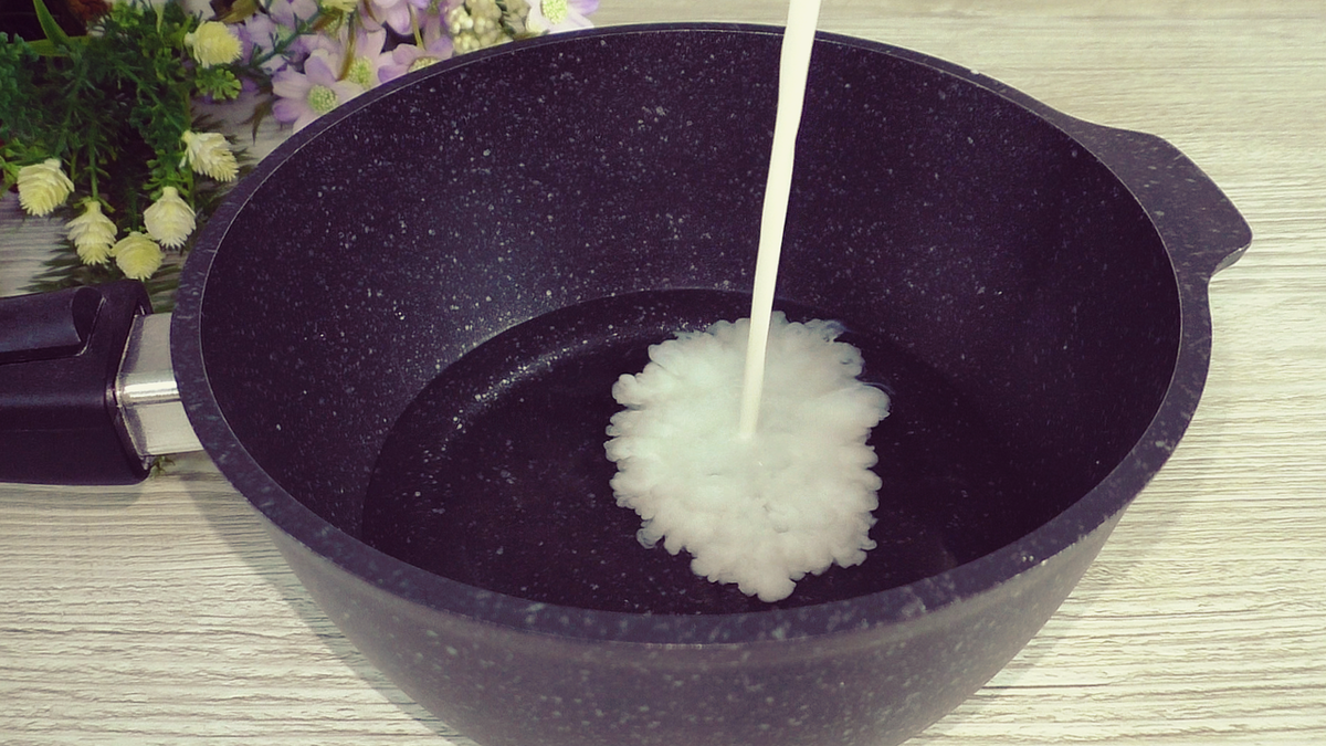 Напиток можно готовить только на молоке, можно даже использовать сливки. Я беру молоко и воду в равных пропорциях, наливаю в кастрюлю и ставлю на плиту, довожу до кипения.