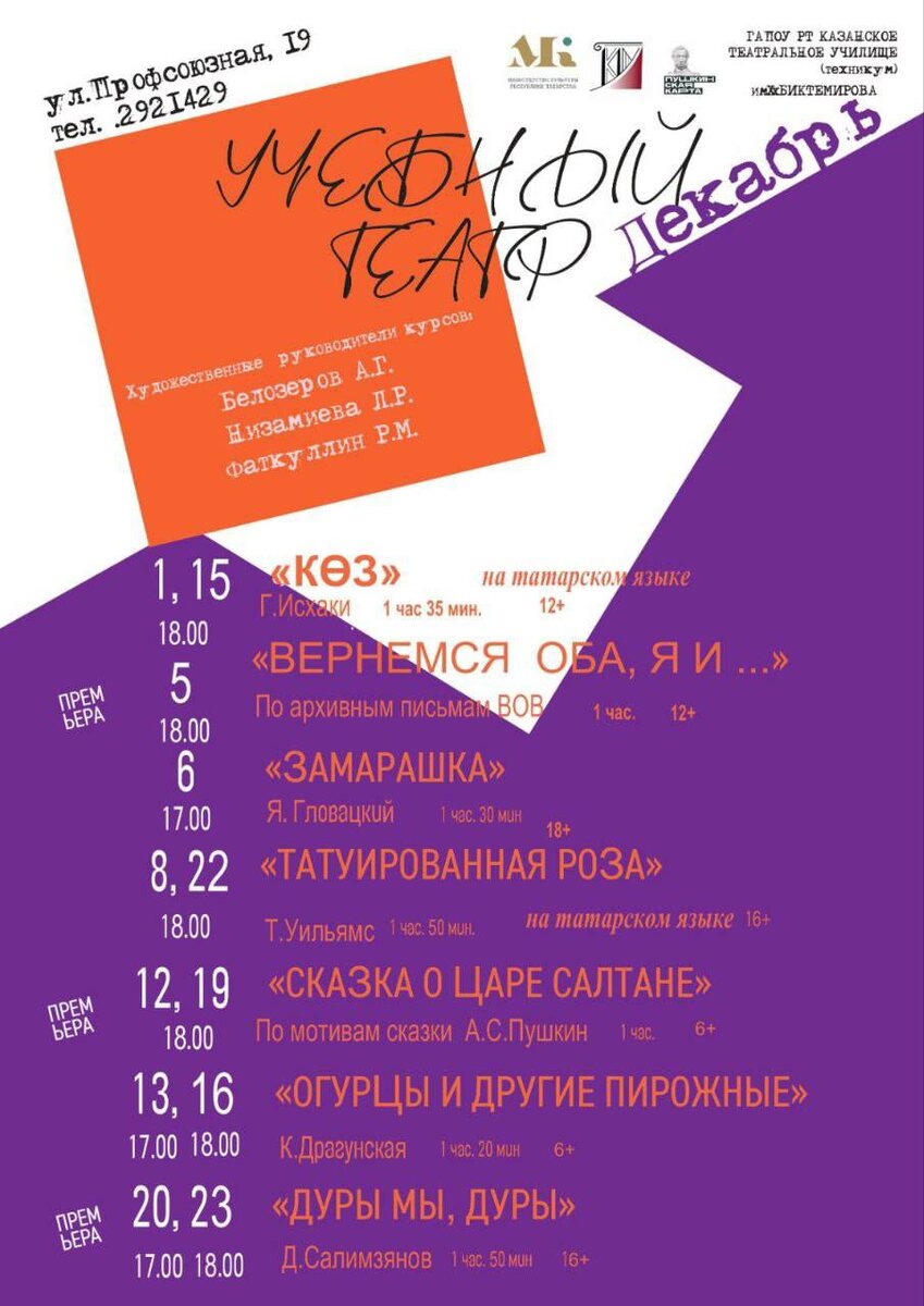 🗄Афиша учебного театра на декабрь Если вы еще никогда не были на спектаклях студентов Казанского театрального училища вы многое по теряли. Я была однажды и это что-то очень эмоциональное и чистое. А еще цена 200₽. Я прекрасно понимаю что не всегда есть бюджет именно на культурный досуг. Поэтому сохраняйте и встретимся в зале. Планирую сходить на несколько спектаклей Билеты 📍Профсоюзная,19 📱Интересные места