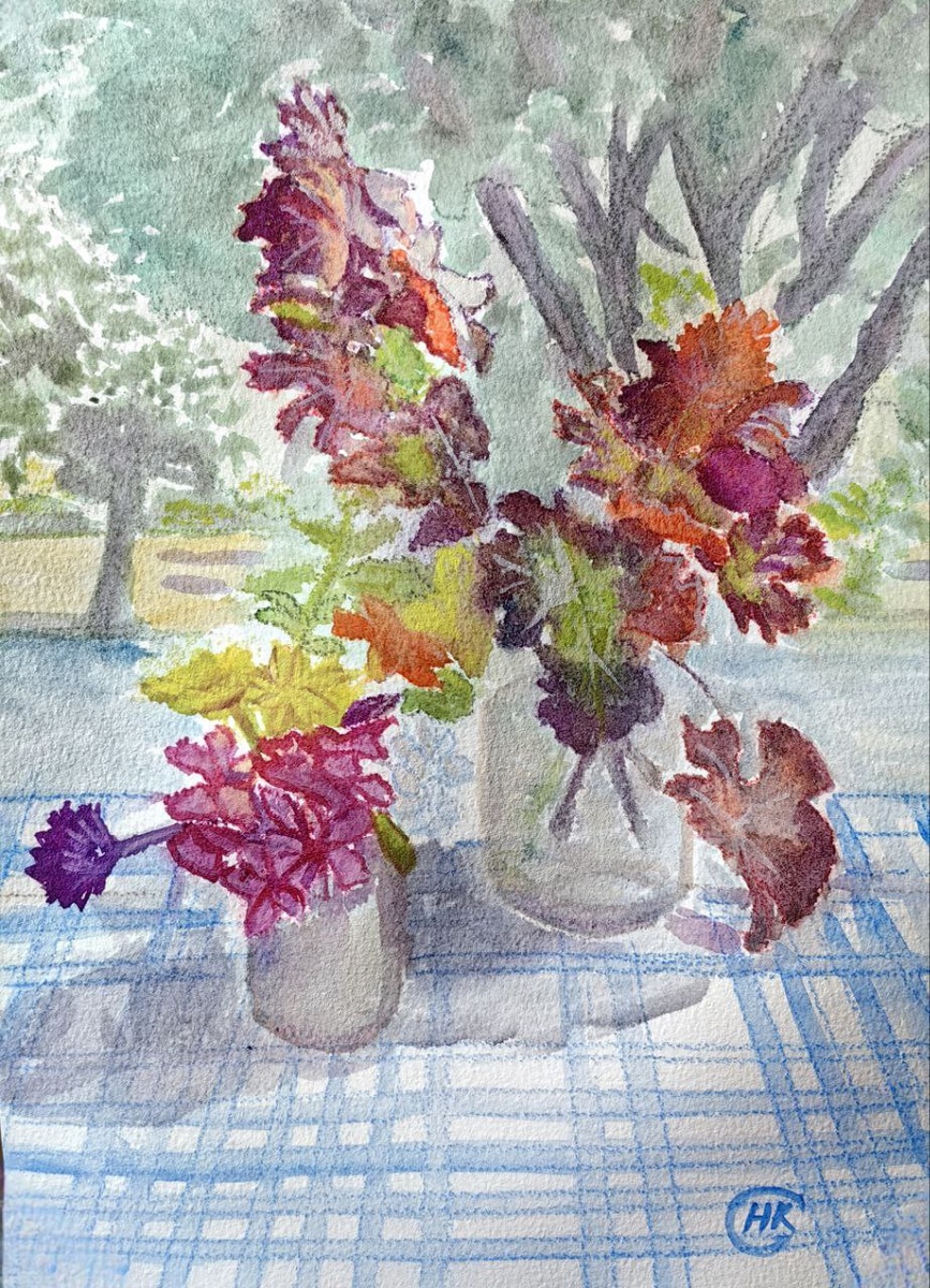 Я нарисовала натюрморт и пейзаж в одном рисунке акварелью и детализировала пастельными карандашами