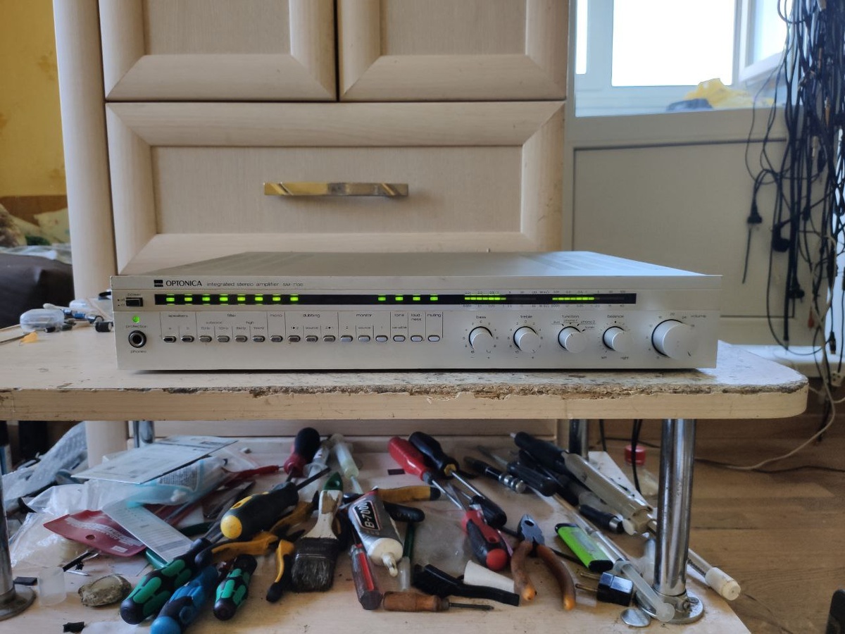 Sharp Optonica SM-7100.Ну вот и добрались до оригинала, нет это не Эстония 010, это как раз то, с чего её копировали, встречаем, шарп оптоника. 😎 Усилок тяжёлый и бублик не маленький, но один минус - это выходные гибридные сборки, если сгорит, то замену не найти. В одном из каналов, эту гибридную сборку уже меняли, но естественно оригинала не нашли, поэтому вкорячили Stk1050, но главное работает.Усилок, владелец принёс не по причине поломки, а с желанием, как и в прошлом аппарате, убрать два входа фоно корректора и сделать два линейных входа, ну не пользуется человек вертушками виниловыми, но у него много кассетных дек, видимо хочет подключить все сразу.😎Два линейных входа добавлены, играет нормально, но по звуку, всё же не сказал бы, что данный усилок прям хватает звезды с небес, обычный японский середняк, ничего выдающегося, да и легендой он не стал, а большинству наших сограждан, известен как Эстония 010, в другой реинкарнации.😇
