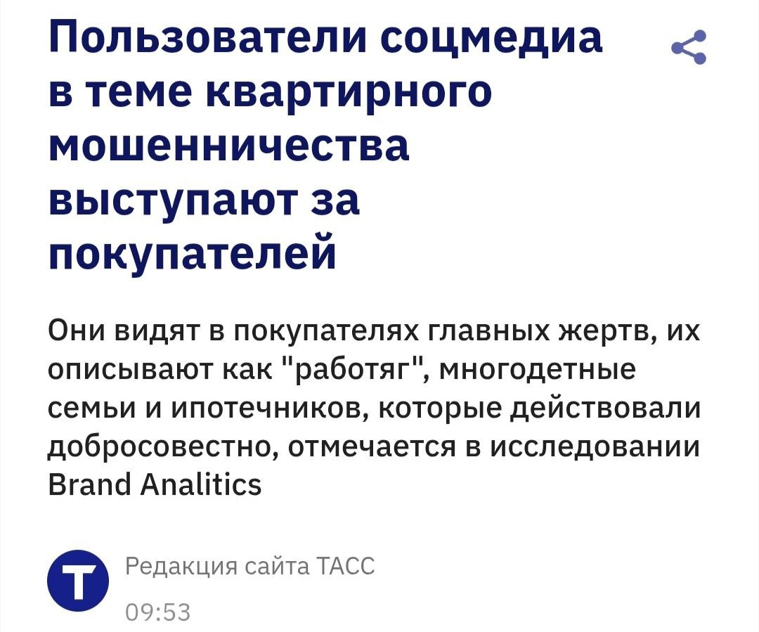 👤 Согласно исследованию Brand Analitics, основанному на анализе более 50 тысяч сообщений в соцмедиа, подавляющее большинство пользователей (80%) выступает на стороне добросовестных покупателей жилья в теме квартирного мошенничества. ✉️ Общественное мнение критикует текущую судебную практику, считая несправедливой ситуацию, когда люди, описанные как «работяги», многодетные семьи или ипотечники, действовавшие добросовестно, теряют и жилье, и деньги. Лишь 3% пользователей поддерживают существующую практику возврата недвижимости без компенсации. 🧊Монолит