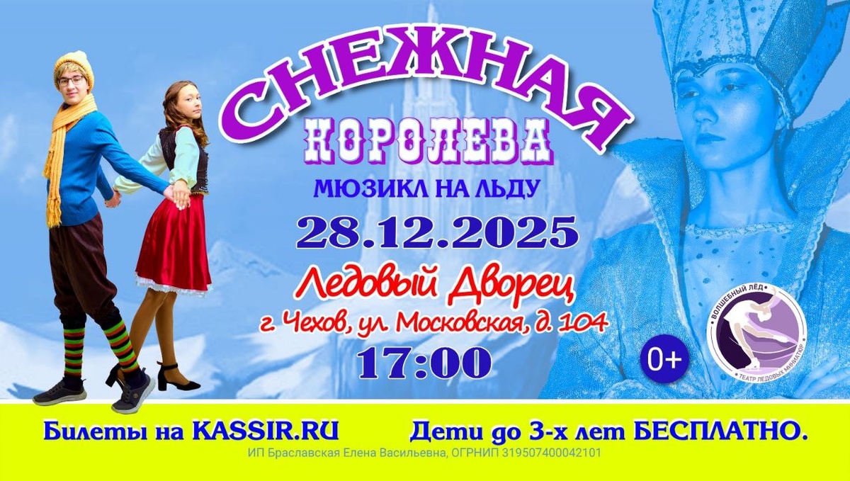Театр ледовых миниатюр "Волшебный лёд" приглашает детей и взрослых на увлекательный мюзикл на льду "Снежная королева". В предверии Нового года приглашаем вас окунуться в сказочный мир, где вы увидите коварство Снежной королевы, приключения смелой Герды, которая прошла трудные испытания в поисках своего брата Кая. В сказке добро всегда побеждает зло и любое горячее сердце растопит все преграды на своем пути. Ждём вас в ледовом дворце 28 декабря, начало в 17:00! Билеты тут⬇️ https://msk.kassir.ru/teatr/ledovyiy-hokkeynyiy-tsentr-vityaz-lhts/myuzikl-na-ldu-snejnaya-koroleva-chehov_2025-12-28