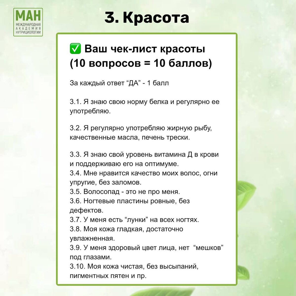 🎯 Задание 3 дня: “Цвет лица — как индикатор” Мы уже разобрали энергию и ЖКТ, а теперь переходим к тому, что видно в зеркале — коже, волосам и ногтям. Но главное: мы оцениваем не внешность, а состояние внутренних систем, которые на неё влияют. ✅Сегодня один раз (лучше утром, до макияжа) посмотрите на своё лицо при дневном свете и спросите: «Этот цвет лица — от сна, стресса или еды?» Постарайтесь связать его с тем, что вы ели, пили и как спали в последние 24 часа. Это простой, но мощный навык ежедневной самодиагностики. 💬 Делитесь своим баллом в комментариях — это поможет наблюдать динамику в конце челленджа. И не забудьте: внесите свой балл в Колесо здоровья, чтобы собрать полную картину. 🔥А 4 декабря на онлайн-встрече «Как собрать пазл здоровья» мы разберём результаты и дадим понятный план, что делать дальше. Ссылка на регистрацию 👉 присоединиться 👈 Завтра перейдём к теме иммунитета — тоже очень показательной 🧬💚