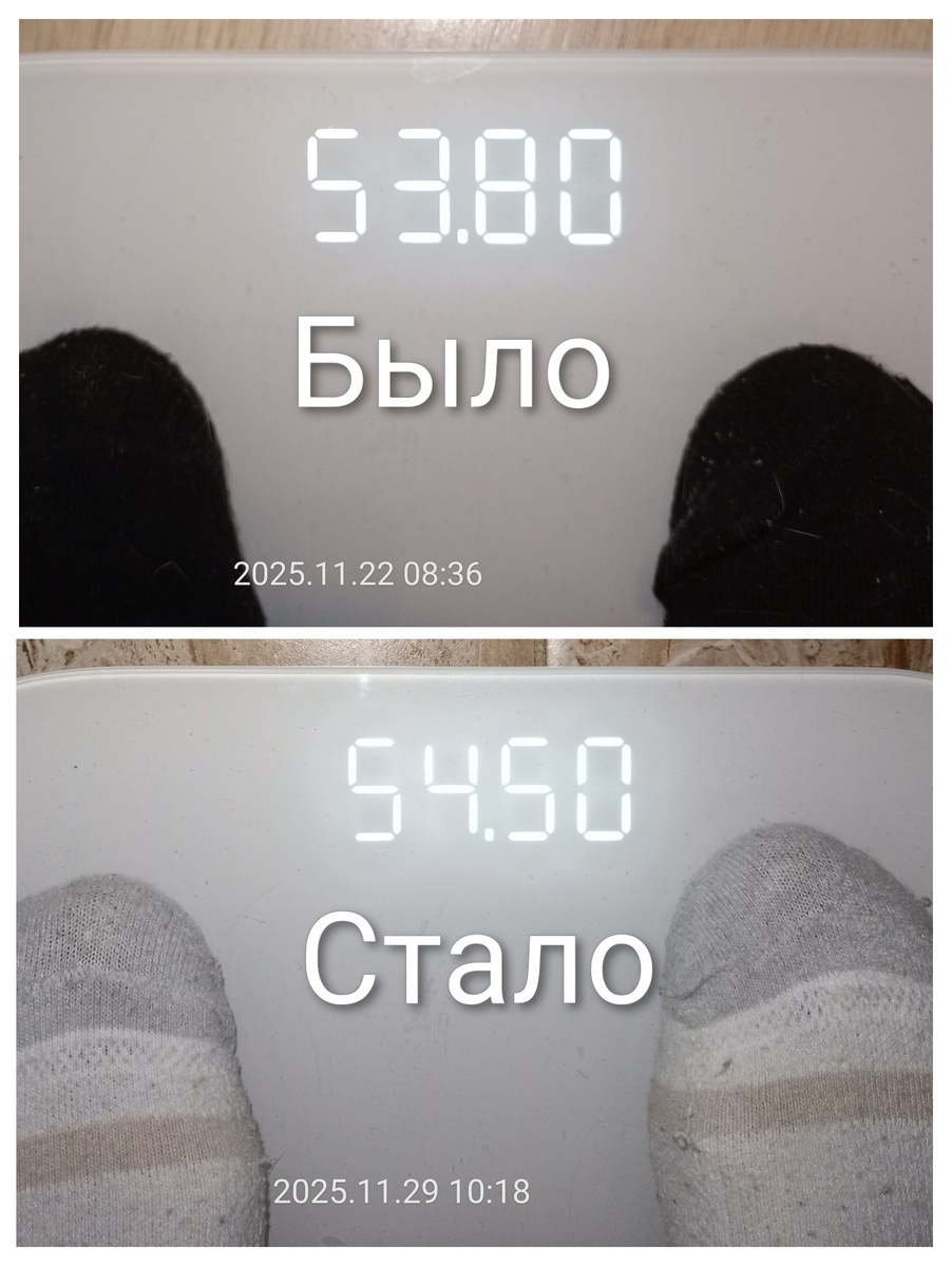 141-е субботнее взвешивание - итоги недели и важные наблюдения. Здравствуйте, друзья! С вами Татьяна, 74 года, рост 151 см, вес 54,5 кг. Сегодня хочу поделиться очередными результатами и своими мыслями о поддержании нормального веса. Напомню, что началось все 27 февраля 2023 года, когда мой вес составлял 82 кг. За два с половиной года постепенного и осознанного снижения веса мне удалось похудеть почти на 28 кг. С июня 2025 года мой вес стабильно держится в диапазоне 54–55 кг. За прошедшую неделю вес немного прибавился на +700 граммов (с 53,8 до 54,5 кг). Причины понятны: восстановилась работа желудочно-кишечного тракта, повысилась калорийность питания, но при этом я не снизила уровень активности, много ходила и занималась на велотренажёре. Важно помнить, что колебания веса это нормальное явление и не повод для беспокойства. Главное сохранять баланс и слушать своё тело. Поддержка здорового образа жизни остаётся ключом к долгосрочному успеху. С 28 ноября начался рождественский пост, пищ
