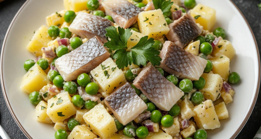Новый взгляд на классику: салат с селёдкой, который покорит гостей без лишних хлопот. Забудьте про надоевшие новогодние салаты — этот рецепт станет настоящей находкой для тех, кто ценит сочетание простоты и эффектной подачи. Секрет блюда — в гармоничном сочетании ингредиентов. Солёная селёдка придаёт яркий вкус, отварной картофель обеспечивает сытность, а зелёный горошек и лук добавляют свежести и хруста. Результат — салат, от которого гости не оставят ни крошки. Для приготовления понадобятся: 200 г филе солёной селёдки, 1–2 картофелины, половина красной луковицы, 100 г зелёного горошка, майонез и зелёный лук — по вкусу. Процесс готовки не потребует кулинарных изысков. Сначала нужно отварить картофель в мундире, дать ему остыть и очистить. Затем нарезать небольшими кубиками — так он лучше соединится с остальными компонентами. Селёдку следует тщательно проверить на наличие костей, даже самых мелких, и нарезать аккуратными кусочками. Красная луковица, нарезанная тонкими полукольцами, доб