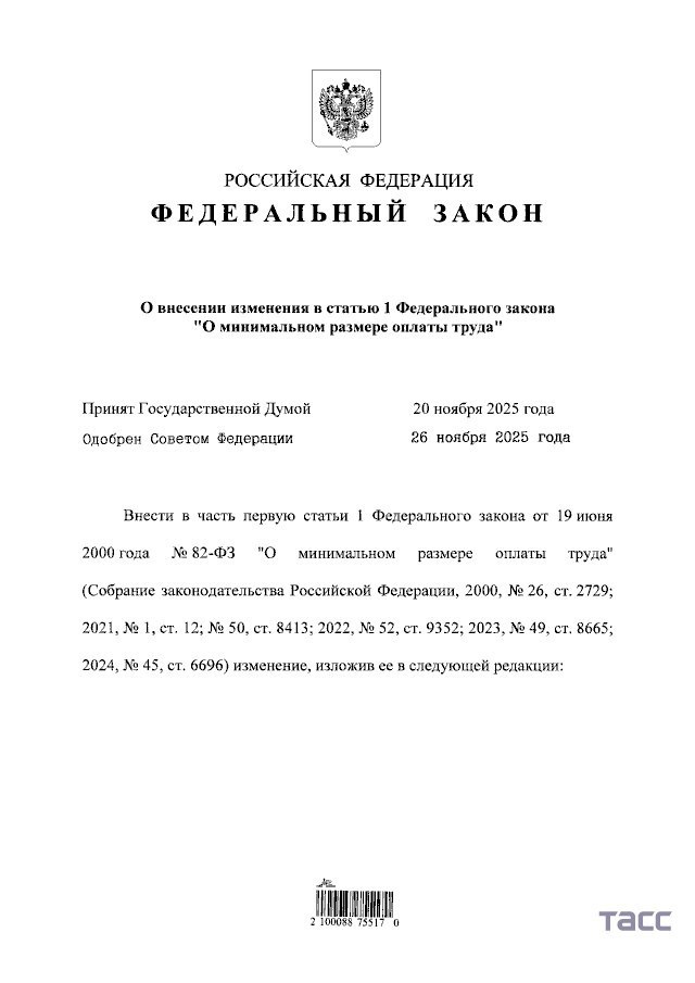 Путин утвердил повышение МРОТ до 27 093 рублей с 1 января 2026 года. Сейчас МРОТ составляет 22 440 рублей.