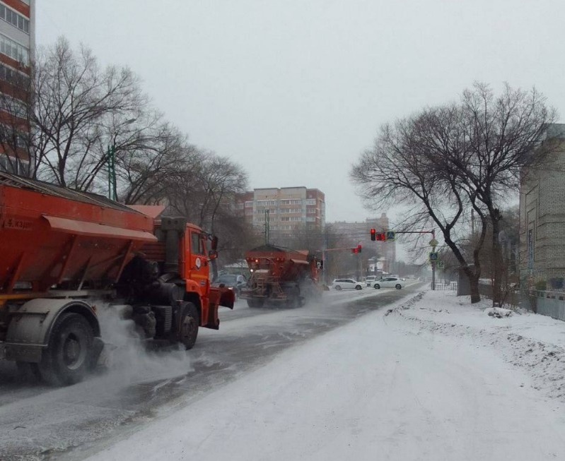 В Благовещенске ГСТК перешел на усиленный режим работы. С началом снегопада в Благовещенске сотрудники ГСТК перешли на усиленный режим работы. В субботу на улицах города задействована техника ГСТК - 23 единицы транспорта, а также четыре привлеченные спецмашины. Трудятся 40 сотрудников, часть из них были отозваны с выходных. В городской администрации рассказали, что коммунальщики подсыпают противогололедными материалами в первую очередь виадуки, подъемы и спуски, кольцевые развязки и перекрестки на магистральных улицах города. В их числе Театральная, Калинина, Загородная, Магистральная, Чайковского, Горького, Ленина, Нагорная. Кроме этого, рабочие подметают тротуары - на Воронкова, Игнатьевском шоссе, Кантемирова, Институтской, Ленина, Калинина и Горького. Также от снега расчищают автобусные остановки и подходы к пешеходным переходам. Синоптики прогнозируют, что в Благовещенске за сутки выпадет около 14 миллиметров осадков - это на 5 миллиметров меньше месячной нормы. Жителей и гостей г