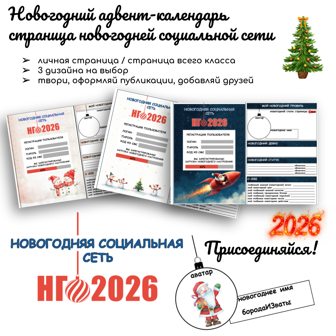 Данный новогодний адвент-календарь создан в виде личной страницы пользователя в специальной новогодней социальной сети. Дети заполняют новогодний профиль, а также каждый день до Нового года оформляют публикации. Страницу новогодней сети может заполнять: - один ребёнок для себя; - весь класс дружно заполняет общий профиль. Таким образом, данный календарь может стать частью новогоднего классного уголка. Оформленные в виде отдельных стенгазет разными классами, такие страницы станут настоящей новогодней социальной сетью школы. Страницы новогодней социальной сети имеют три разных стиля оформления на выбор, при этом оставляют место для собственного творческого оформления (можно раскрашивать, рисовать, обводить, приклеивать стикеры из набора). Заполнение новогоднего профиля пользователя: Пусть ожидание Нового года будет необычным и интересным! скачать можно по ссылке: Или перейти на страницу сообщества Вконтакте: https://vk.com/4popugaya