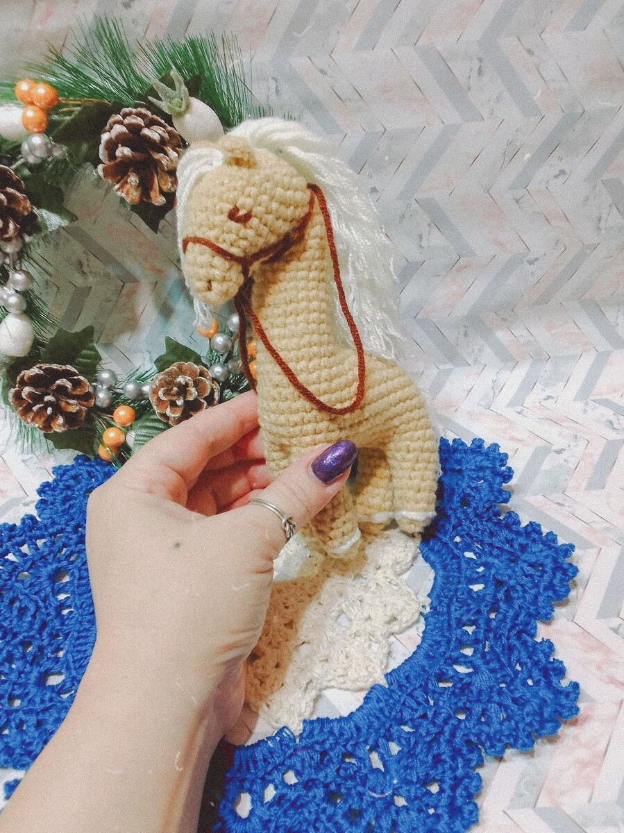 Всем здравствуйте 👋👋👋 Подготовила для вас подробное МК маленькой лошадки . Подготовка к новому году идёт полным ходом 🎄🎄🎄и поэтому лошадки сейчас очень в цене. Связать такую милашку можно для подарка родным и близким , для декора и украшения ёлочки . Тем более , что по этому описанию , лошадку я вязала за один день. При этом , конечно попутно , занимаясь своими домашними делами . А самое главное , что я получила - это огромное удовольствие от самого процесса вязания и самого результата , после окончательного оформления лошадки ☺️☺️☺️ Давайте приступим 🧶🧶🧶 Материалы Пряжа Наполнитель Крючок ✓3 Игла для сшивания Маркер Milk Cotton бежевого , коричневого и молочного цвета . Сокращения ВП - воздушная петля КА - кольцо амигуруми ссн - столбик с накидом сбн - столбик без накида пссн - полу столбик с накидом уб - убавление приб - прибавка Голова Бежевый цвет . 6 ВП в КА 6 приб =12 сбн (1 сбн , 1 приб )*6=18 сбн ( 2 сбн , 1 приб )*6=24 сбн ( 3 с