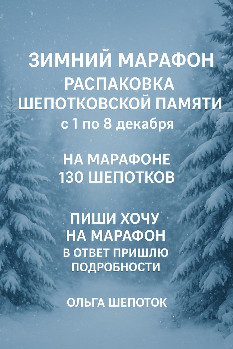 Стартуем 1 декабря! 🎄 ЗИМНИЙ МАРАФОН «РАСПАКОВКА ШЕПОТКОВСКОЙ ПАМЯТИ» С 1 по 8 декабря Что будет на марафоне: • глубокая распаковка шепотковской памяти • 130 шепотков для практики и жизни • сакральные знания, которые раскрываются постепенно • поддерживающие задания и мягкая структура • атмосфера женского круга, где можно быть собой Для чего это всё: Чтобы ты вспомнила, кто ты. Чтобы жизнь снова стала наполненной, лёгкой и осмысленной. Чтобы вектор повернулся туда, где больше тепла, уверенности, любви. Если чувствуешь отклик — просто напиши мне в Telegram: 👉 ХОЧУ НА МАРАФОН https://t.me/OlgaShepotok в ответ пришлю подробности. 🎁 Для Доней VK — скидка 20% Напиши заранее и пришли скрин из ВК. Количество мест ограничено. 18+ ❄️ Пусть эта зима станет началом новой внутренней истории. ☃️ 🎄 ❄️ ☃️ 🎄 ❄️