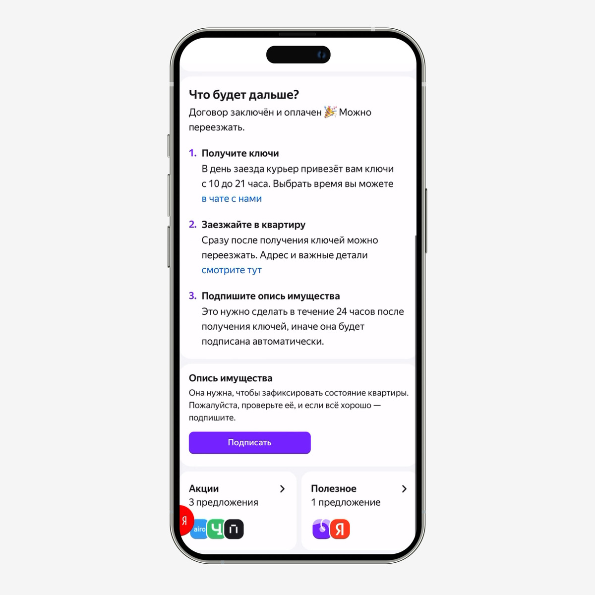 После оформления договора через Яндекс Аренду вам останется только дождаться курьера с ключами от квартиры. Все дальнейшие шаги будут отображаться в вашем личном кабинете. В течение 24 часов после заселения нужно будет подписать опись имущества. Если этого не сделать, она будет подписана автоматически. Главное – внимательно проверить все пункты описи. Если заметите повреждения, которые не были указаны ранее, вы можете добавить их самостоятельно через личный кабинет. А если сдавать или снимать квартиру через Яндекс Аренду, то по поводу договора можно не переживать. Он составлен профессиональными юристами и защищает интересы как собственника, так и жильца. Всё прозрачно и без подводных камней: включая порядок оплаты ЖКХ. Подписать его можно с помощью СМС-кода. Подписывайтесь, чтобы знать всё об аренде жилья