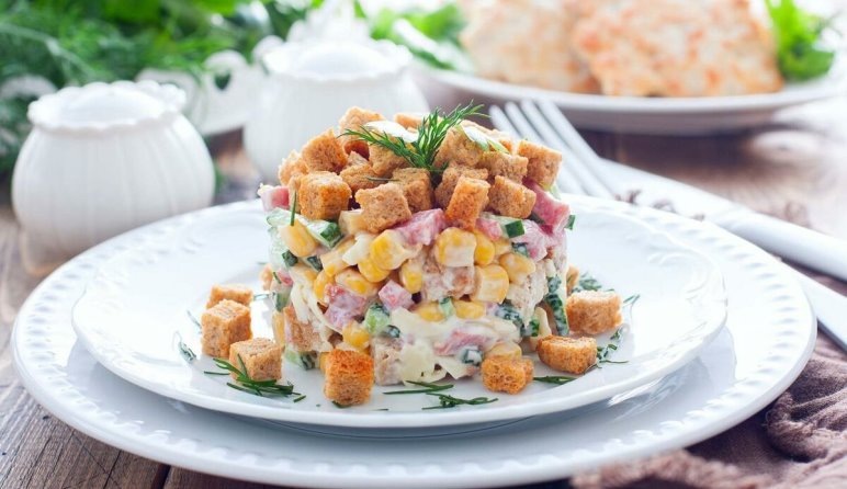 Вот такие вкусные и простые салаты с сухариками можно приготовить по любому поводу. Сухарики можно добавлять практически в любой салат, и не только. Особенно вкусно, когда гренки сделаны в домашних условиях.