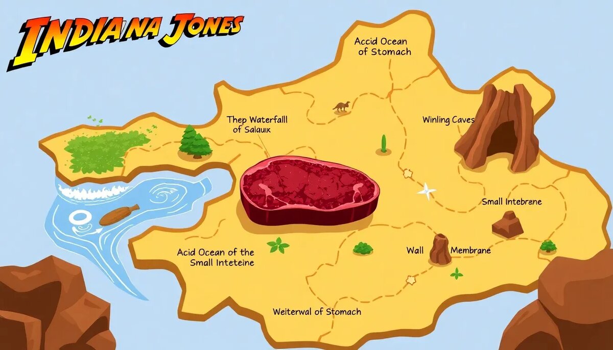 Представьте, что сочный кусок стейка, который вы только что съели, — это не обед, а целая экспедиция. Тысячи невидимых отважных путешественников — молекул белка — отправляются в самое опасное и удивительное приключение внутри вашего тела. Их цель — не найти сокровище, а стать им: превратиться в энергию, мышцы, гормоны, крепкие ногти и сияющую кожу. Но путь их тернист и полон испытаний. Давайте проследуем за ними от первого укуса до финального превращения! Испытание 1: Бурлящий Водопад Слюны и Кислотный Океан Приключение начинается во рту. Здесь наших отважных путников ждет первое испытание — механическое. Зубы работают как мощные жернова, перемалывая стейк на мелкие кусочки. Слюна смачивает эту массу, помогая ей скользить вниз, но главные враги белка — ферменты, расщепляющие углеводы, — на него почти не действуют. Белок выходит из этой битвы почти невредимым. Далее — обрыв. Пищевод — это скоростная горка, ведущая прямиком в самое страшное место всего маршрута: в «Кислотный Океан» желу