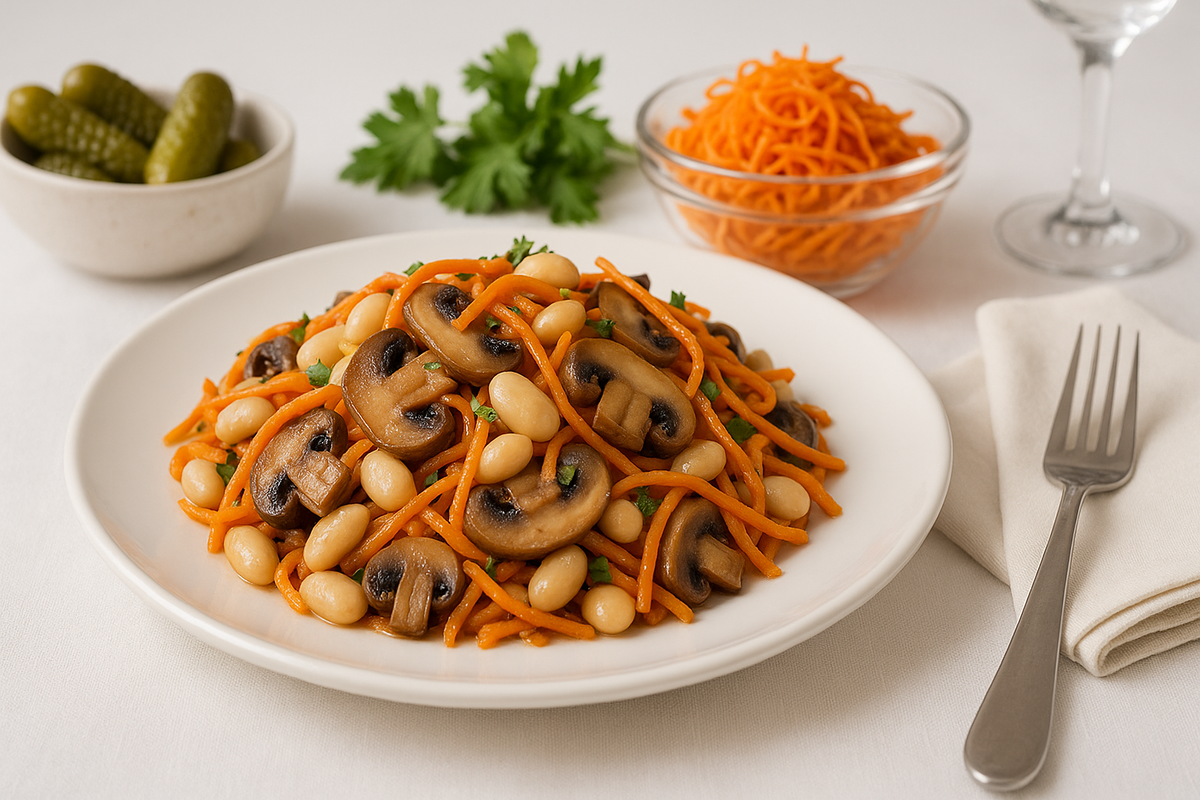 Когда хочется чего-то яркого, выразительного и сытного, но без тяжести, я выбираю этот салат. Он собирается быстро, выглядит как эффектная закуска, а вкус цепляет с первой вилки. Острота моркови, нежная фасоль, грибы с тёплым ароматом жарки и мягкая кремовая заправка. Попробуете однажды и будете повторять снова. Ингредиенты (на 2 порции) • Корейская морковь 200 г • Фасоль красная консервированная 250 г • Шампиньоны 200 г • Яйца 2 шт • Перец сладкий 1 шт • Майонез 2 ст л • Горчица 1 ч л • Соль • Перец по вкусу Приготовление Грибы нарезаю пластинами и обжариваю до лёгкой румяной корочки. Яйца варю вкрутую, остужаю и режу крупными кусками. Соединяю фасоль без лишнего сока, корейскую морковь, грибы и сладкий перец. Добавляю яйца. Заправка простая и рабочая: смешиваю майонез с горчицей, подсаливаю, перчу. Перемешиваю салат аккуратно. Подаю в глубокой тарелке, сверху добавляю перец и немного зелёного лука для яркости. На фото он выглядит контрастно, насыщенно, как будто его только ч