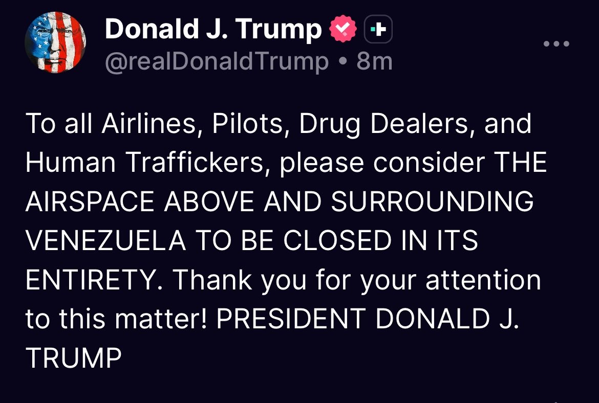 ✍️ Воздушное пространство над Венесуэлой и близ нее закрыто