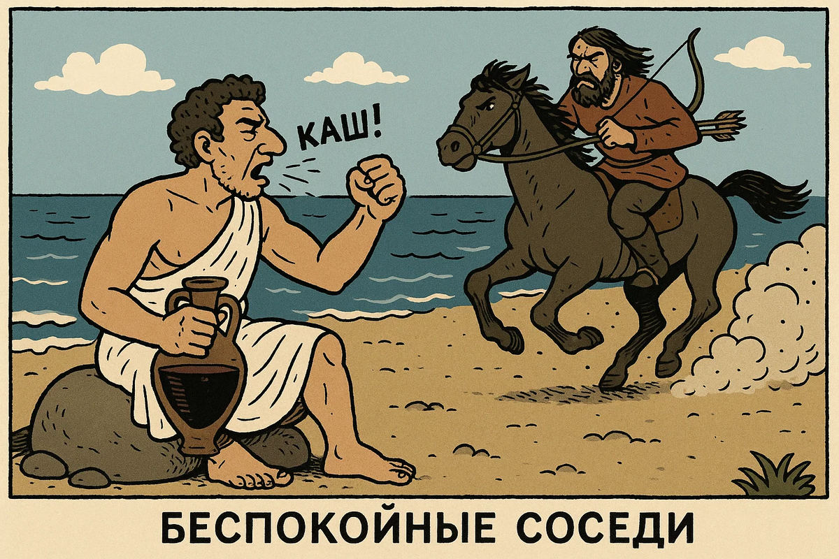 - Греки: Они приплыли и построили красивые города-колонии на берегах Чёрного моря (в Крыму и на Кавказе): Херсонес, Пантикапей. Они принесли сюда театр, виноград и демократию. 🍇🏛️