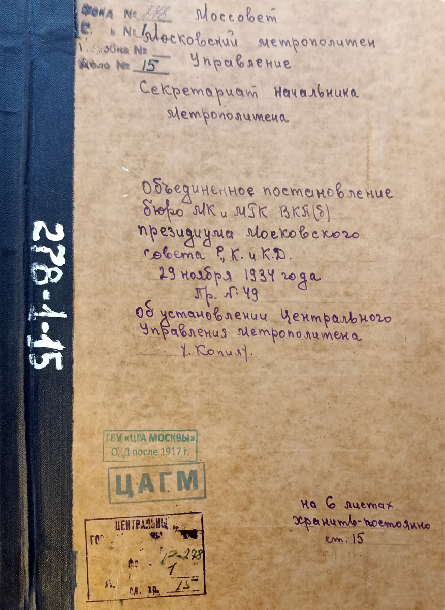 29 ноября 1934 года было подписано объединённое постановление бюро МК и МГК ВКП(б) президиума Московского Совета Р.,К. и К.Д. № 49 об установление Центрального Управления метрополитена. 15 ноября 1934 года пошло совещание под председательством т.Кагановича по вопросам строительства метрополитена. Протокол этого совещания и был утверждён 29 ноября. В этом протоколе, с которым вы можете ознакомится, обсуждались вопросы эксплуатации метрополитена, установлении служб, формы, времени работы, тарифы и другие вопросы. Иногда считают, что службы были утверждены 15 ноября, но это в корне не верно. В этот день было всего лишь совещание. А утвердили его — 29 ноября 1934 года.