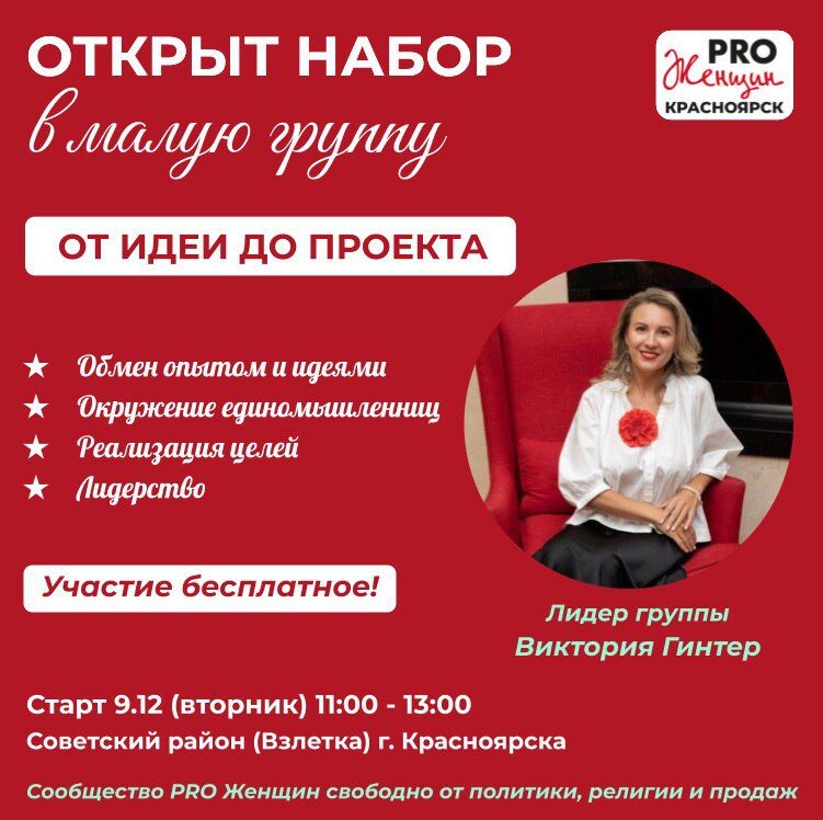 🔔 ОТКРЫТ НАБОР В МАЛУЮ ГРУППУ 🌹 «ОТ ИДЕИ ДО ПРОЕКТА» Участие бесплатное! 🎁 На связи лидер сообщества PRO Женщин Виктория Гинтер «Я объявляю набор в малую группу “От идеи до проекта” - для женщин-лидеров по сути, которые знают чего хотят, готовы двигаться вперёд и воплощать свои идеи в живые, работающие проекты и источники дохода. Если ты чувствуешь в себе масштаб, устала "думать и откладывать" и готова запускать и реализовывать — тебе сюда. ПРИХОДИ. Эта группа для тебя, если: ✅ У тебя уже есть идея или направление, и ты готова их запустить ✅ Ты стабильна в своём бизнесе и задумываешься о ещё одном бизнес-проекте ✅ Ты ощущаешь в себе лидерский потенциал и хочешь раскрыть его полноценно ✅ Тебе важно двигаться в среде таких же сильных, осознанных женщин ✅ Ты хочешь встроить в свою жизнь регулярность и системность ✅ Ты готова действовать, а не ждать подходящего момента Для кого эта группа? ➡️ Для женщин, которые развивают или хотят запустить своё дело, проект, сообщество, бизнес. ➡