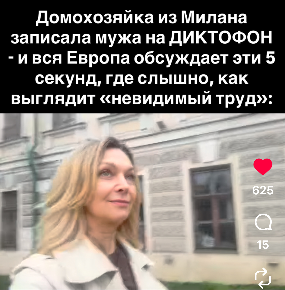 1. Она включила диктофон не ради скандала, а чтобы понять, почему ощущает усталость, даже когда физически ничего не делает. На записи — утро. Она собирает ребёнка, параллельно отвечает на рабочие сообщения, вспоминает, что завтра у свекрови день рождения, и проверяет, остался ли хлеб. Муж в это время спокойно пьёт кофе. Никто не кричит, нет конфликта, но слышно самое страшное — её мозг работает за двоих, а он даже не замечает. 2. Итальянские СМИ писали, что миллионы женщин узнали в этой записи себя. Социологи называют это «ментальным трудом» — когда ты несёшь не задачи, а саму ответственность за их существование. Планировать, помнить, предугадывать, подстраивать — работа, которую никто не считает. Один профессор из Болоньи сказал: «Мы измеряем всё, кроме нагрузки на голову женщины». Это тот случай, когда даже отдых не отдых, потому что в голове идёт нескончаемый чек-лист. 3. Когда запись разошлась по Европе, мужчины спорили: «Но ведь я тоже помогаю!». И это ключевая ловушка — помощь