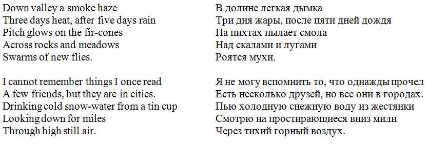 В стихотворении Снайдер использует вторую строфу для описания своего жизненного опыта изоляции от человечества. В своей «дзен-лирике» он намекает на то, что аскетизм и изоляция ведут к большему пониманию и просветлению. Для Снайдера это просветление происходит от слияния с природой. Здесь Снайдер представляет перед читателем неформальную иерархию знаний и опыта: во-первых, Снайдер пишет, что в этой нетронутой человеком, так называемой «первозданной» обстановке, он «не может вспомнить» то, что он «однажды читал», подразумевая, что ценность и полезность традиционного образования становятся устаревшим или, если не устаревшими, то, по меньшей мере, «спящими». Затем он отмечает, что помнит «Несколько друзей, но они в городах», таким образом отмечая, что, хотя личные отношения и имеют способность создавать более продолжительное впечатление, они тоже могут быть мимолетными. И, наконец, Снайдер описывает опыт, который занимает самое высокое значение по сравнению с традиционным обучением и общим взаимодействием с человечеством: «Пью холодную снежную воду из жестянки / Смотрю на простирающиеся вниз мили / через тихий горный воздух». Хотя Снайдер ничего не говорит о том, сможет ли он вспомнить этот конкретный опыт, но он не оставляет никаких сомнений о влиянии этого опыта на него. Использование герундия «Drinking» и «Looking» создает ощущение безвременья или вечности, что помогает достигнуть эффекта японского хайку, в котором время приостанавливается. Этот эффект приостановки времени также помогает отделить опыт, происходящий в стихотворении от первых двух строк строфы, где образование и друзья остались в прошлом и их едва ли можно вспомнить. Эта безвременность является главным элементом стихотворения: образы первой строфы – легкая дымка в долине, жара и дождь, поле и скалы, луга и мухи, – все это соединяется в голове поэта и помещается одновременно и в вечность, и в настоящий момент, где он пьет «снежную воду» и смотрит на вид с горной вершины.