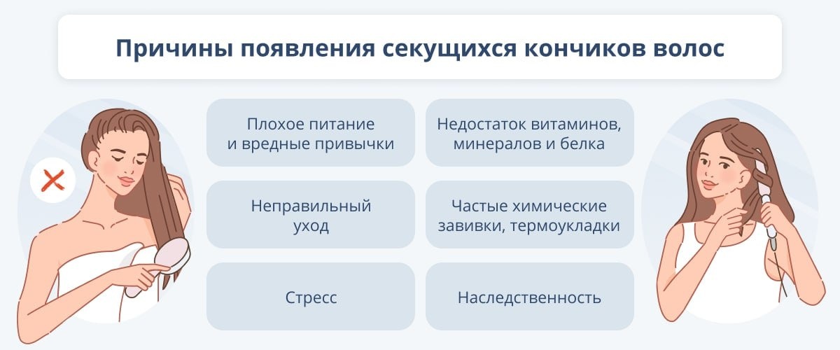 ❓Почему волосы становятся сухими и секущимися? Сухие и секущиеся волосы — это не просто косметическая проблема. Чаще всего это следствие нарушения целостности стержня волоса и снижения уровня естественного увлажнения. В норме каждый волос покрыт плотной кутикулой — тонким слоем кератиновых чешуек, которые защищают внутренние структуры от потери влаги и механических повреждений. Когда эта защита нарушена, кончики начинают расслаиваться, а волосы становятся тусклыми, ломкими и пористыми. 💥Главные причины сухости и сечения — комплексные. - Физическое воздействие: частое использование фена, утюжка, плоек, горячая вода при мытье головы. - Химические факторы: окрашивание, осветление, завивки, агрессивные шампуни с сульфатами. - Климат и уход: сухой воздух, солнце, морская вода, отсутствие термозащиты. - Физиологические причины: дефицит белка, железа, цинка, витаминов группы B, а также обезвоживание.