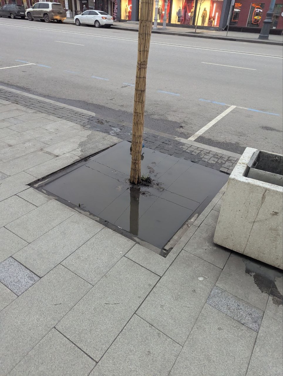 В результате начавшегося 3 года назад благоустройства проспекта Революции в Воронеже, большинство высаженных импортных немецких клёнов не выжило. И, как можно заметить, причина здесь не в выбранном сорте взрослых саженцев, а в особенностях конструкции тротуарного покрытия. Бетонное основание под плитку было залито до самого края проезжей части. Вместо лунок получились бетонные мешки, из которых даже после небольших осадков влага не уходит. Корневая система деревьев летом не получает влаги из почвы, а осенью и зимой гниёт в воде. Так проспект выглядит сегодня...