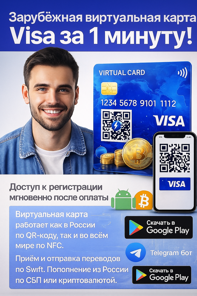 В 2025 году жить без полноценного зарубежного банковского счёта и удобной виртуальной карты стало почти невозможно. Подписки Netflix и Spotify, покупки в App Store и Steam, оплата отелей на Booking, реклама в Google и Meta – всё это либо не работает с российскими картами, либо требует сложных обходных путей. Но есть решение, которое реально оформляется за 60 секунд и даёт сразу всё необходимое. Представьте: вы прямо сейчас нажимаете купить сейчас, оплачиваете удобным способом, и через минуту получаете персональную ссылку. По ней вы мгновенно создаёте свой личный зарубежный онлайн-банк с мультивалютными счетами – рубли, евро, доллары, гривны и другие валюты, плюс отдельный криптовалютный счёт в стейблкоинах. Сразу после регистрации вы можете выпустить виртуальную карту Visa или Mastercard (на выбор) и пользоваться ею где угодно в мире: А в России эта же виртуальная карта работает ещё интереснее. Благодаря встроенному крипто-шлюзу вы просто сканируете QR-код на кассе в Пятёрочке, Магнит