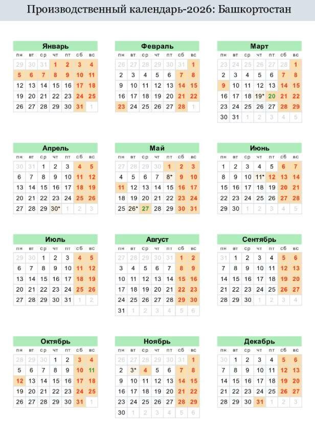 В 2026 году в Башкирии будет девять сокращенных рабочих недель. В 2026 году жителей Башкирии ждут девять коротких рабочих недель. В феврале три праздничных дня — с 21 по 23 число. Затем короткая неделя в марте: работать нужно будет с 10 по 13 число. В апреле перед майскими праздниками — с 27 по 30 число. Сокращённый рабочий период также ожидается в конце мая (12–15 числа) и в начале июня (8–11 числа). Из-за того что 4 ноября и 31 декабря — выходные, ноябрьская рабочая неделя будет состоять всего из четырёх дней, а в конце декабря работать придётся всего три дня. Дополнительный выходной в Башкирии появится благодаря празднику Ураза-байрам. Он выпадает на пятницу, 20 марта, поэтому рабочая неделя сократится до четырёх дней — с 16 по 19 марта. Курбан-байрам, который состоится 27 мая, тоже добавит выходной. Этот праздник разобьёт неделю на две части.