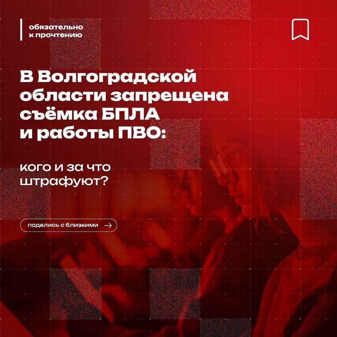 Обнаружил дрон? Не снимай! 🚫 В Волгоградской области введён запрет на фотосъёмку и публикацию сведений о беспилотных летательных аппаратах и работе противовоздушной обороны. Нарушение грозит штрафом до 1 миллиона рублей!