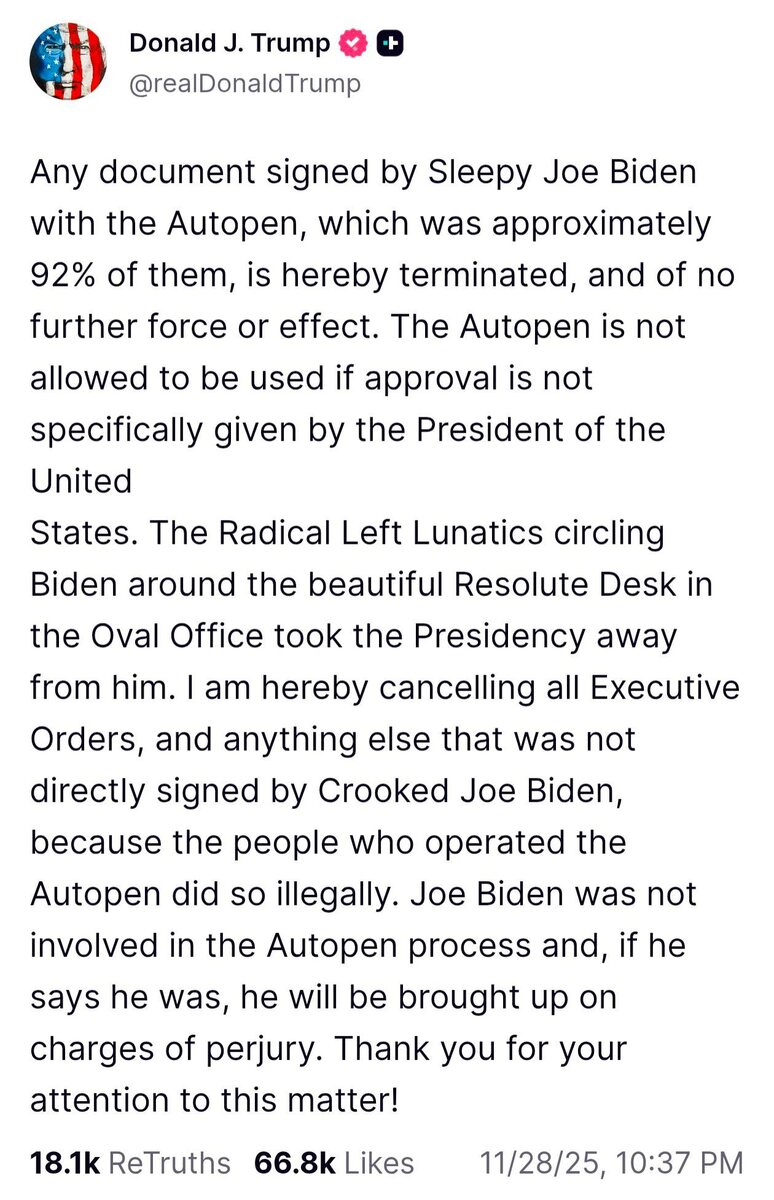 🔸Сегодня Дональд Трамп издал указ о признании недействительными всех документов, утвержденных Джо Байденом с помощью устройства для автоматической подписи. 🔸Трамп заявил, что его предшественник в силу своего когнитивного состояния не давал осознанного распоряжения на подпись этих указов, поэтому, их визировали неуполномоченные сотрудники аппарата. 🔸Действующий президент США отметил, что мера касается 92% всех указов Байдена. Хотя озвученная цифра, скорее всего, завышена, новое указание Трампа затронет сотни документов. 🔻Какие именно приказы и документы попали под удар? 🔸«Январьские помилования»: В последние дни своего срока (январь 2025 года) Байден издал серию массовых помилований — в список вошли члены комитета Палаты представителей по расследованию событий 6 января, доктор Энтони Фаучи, бывший председатель Объединённого комитета начальников штабов генерал Марк Милли, члены семьи Байдена и другие фигуры, участвовавшие в преследовании Трампа. 🔸Климатические и энергетические иниц