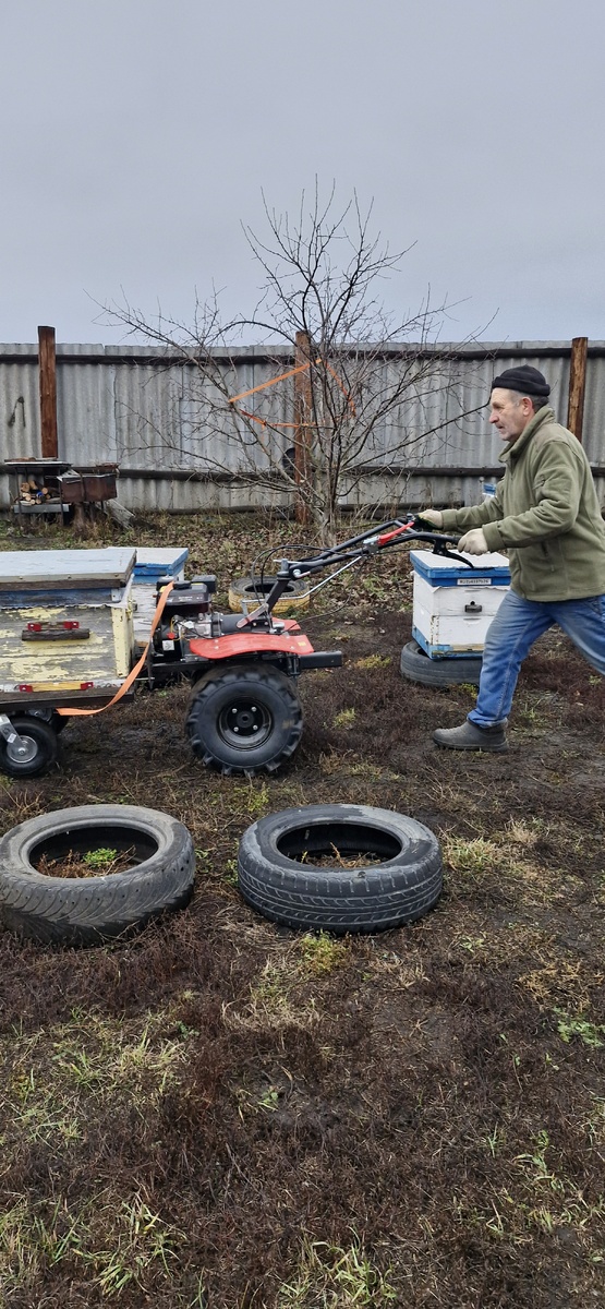 Сегодня 29.11.2025 убираем пчёл в омшаник. Вчера с вечера в ночь был проливной ливень и сильный туман 5-6 часов. Сегодня убираем пчёл, погода отличная +6 тепла , ветра нет. Часть ульев в ручную убираем, часть мотоблоком- очень удобно. Важно закрыть литки при транспортировке и перемещении ульев. Ульи размещаем в 2-3 яруса. После того, как пчелы успокоятся, можно будет открыть литки нижние и верхние. Помещение обязательно будет проветриваться. В целом убирали пчёл в течение дня.