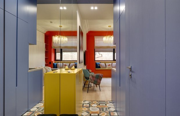 В этой квартире нет ни единой случайной детали Прихожая в проекте Kogan Design Studio — это не просто коридор, а полноценная зона с ярким характером и функциональной нагрузкой. Несмотря на скромный метраж всей квартиры, здесь удалось разместить сразу несколько встроенных систем хранения и полноценную зону для переобувания, и при этом интерьер выглядит цельно и динамично. 📷Дизайн: Kogan Design Studio Всю прихожую оформили в насыщенном васильковом оттенке: стены, потолок, двери и встроенные шкафы сливаются в единый цветовой монолит. Прием делает пространство визуально чище и позволяет замаскировать множество деталей — от систем хранения до технических блоков. В сочетании с глянцевыми зеркальными панелями это решение визуально расширяет пространство и создает глубину даже в узкой зоне. Потолок тоже выкрашен в синий, что помогает собрать пространство и добавить камерности. 📷Дизайн: Kogan Design Studio Ярко-желтая консоль в центре прихожей не просто акцент, а еще один многофункциональн