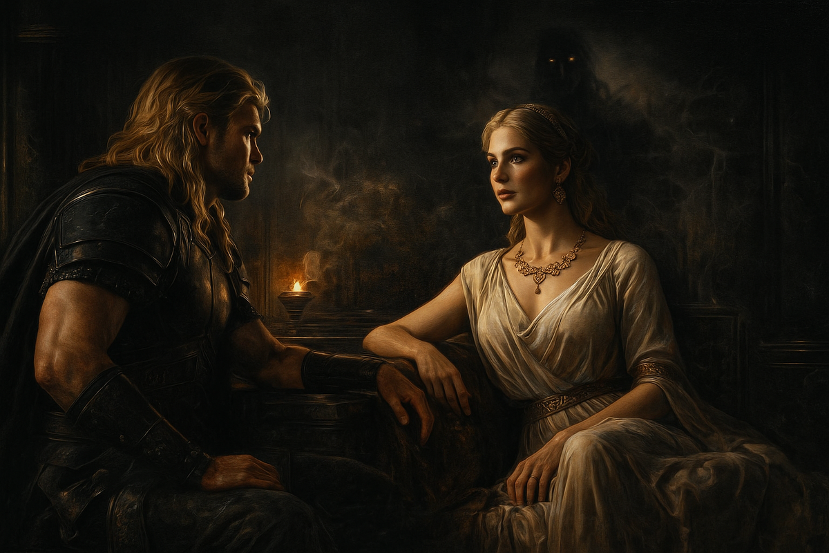 Заканчивая чреду этих риторических вопросов, она со всем присущим ей изяществом приблизилась к воину и села ему на колени. Одной рукой поглаживая его по голове, а другую положив ему на грудь, она продолжила: