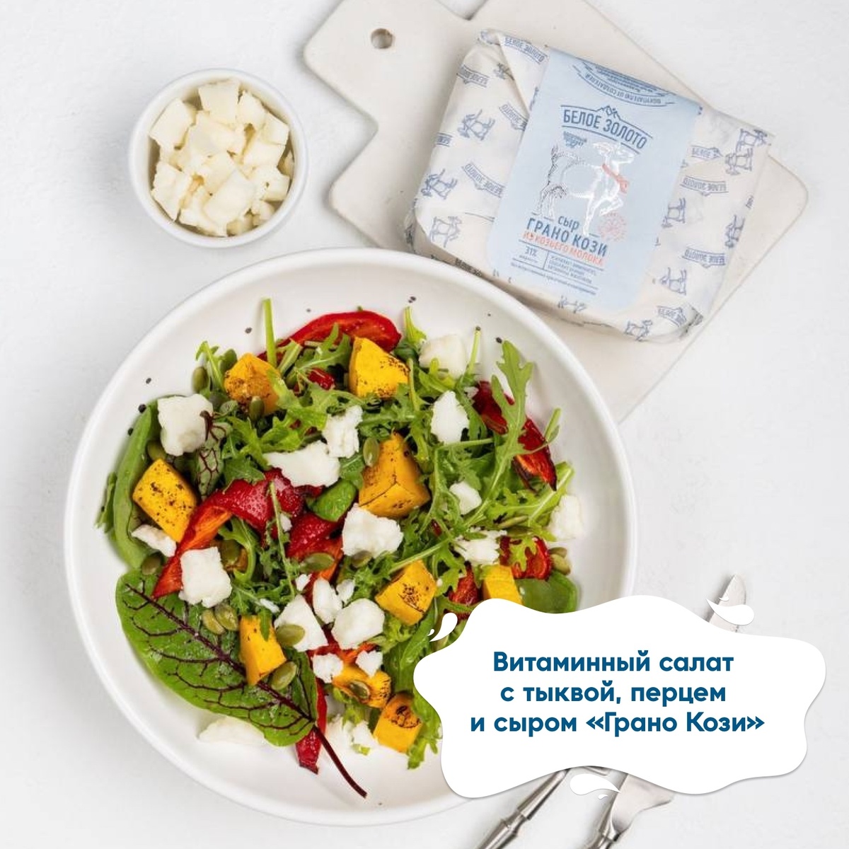 Яркий, сочный и полезный — идеально подойдет для осеннего меню . В его основе нежная тыква, сладкий перец, зелень и белоснежный козий сыр «Грано Кози». Именно он придает блюду пикантный и изысканный вкус. А если добавить хрустящие тыквенные семечки, салат приобретёт выразительную текстуру.