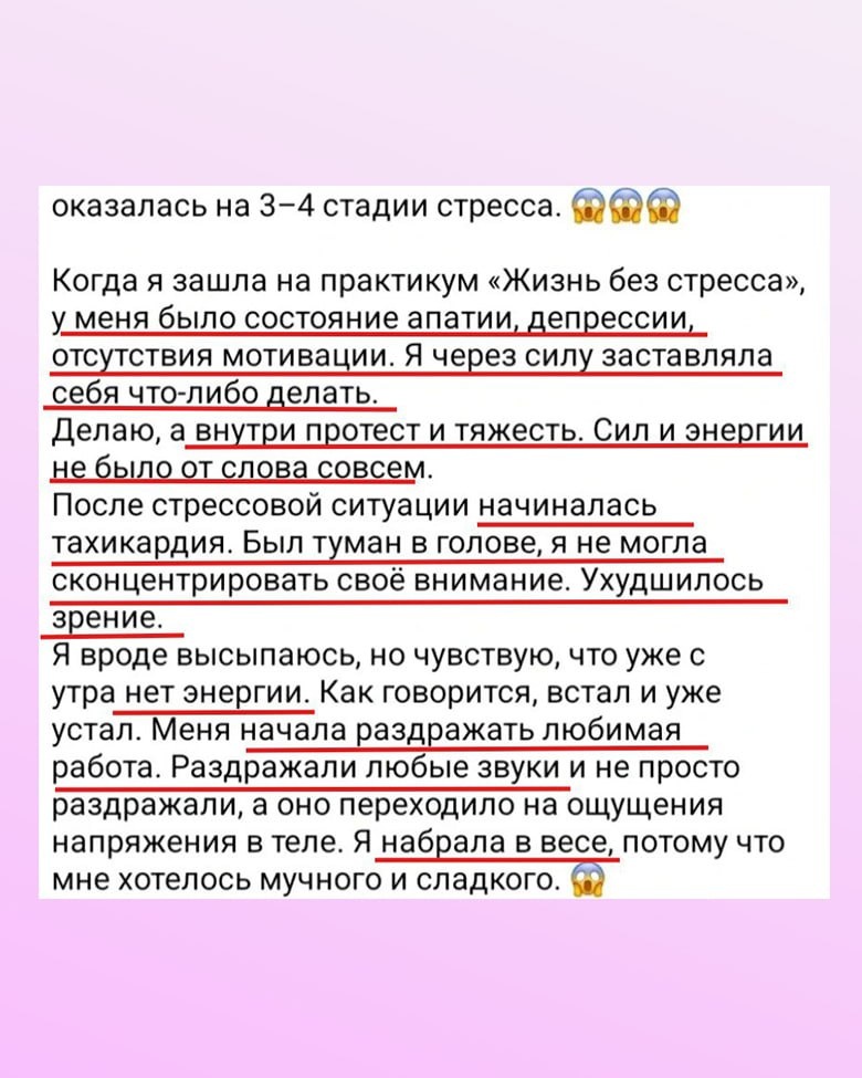Дорогие, это НЕ две разные истории!! Это один и тот же человек с разницей всего 2 недели😍 И вот почему у меня мурашки➡️ 💔 Оказалась на 3-4 стадии стресса… А многие ходят так годами!! Апатия. Делала всё через силу. После любого переживания тахикардия. Туман в голове, нет концентрации. Утром просыпаюсь и уже устала. Раздражало всё, даже любимая работа. Ухудшилось зрение. Хотелось только мучного и сладкого… Девочки, кому знакомо?🤔 Когда стресс тихо сжимает тело изнутри, то мы находим оправдание: возраст, усталость, жизнь такая… Прошло 14 дней!.. 🥰 просыпаюсь без будильника и бодрая. У меня появилось желание действовать и делать… Практикум “Жизнь без стресса” научил меня в моменте справляться со стрессовой ситуацией… Если делать все то, чему нас учили на практикуме, мы уже с утра можем снять напряжение с помощью практики «Заземления» или медитаций, утренних ритуалов. И целый день ходить в хорошем и позитивном настроении. 🙂 Стресс, апатия, раздражительность - это не навсегда!! О