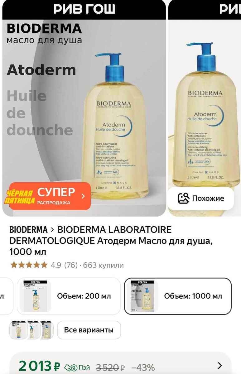 BIODERMA LABORATOIRE DERMATOLOGIQUE Атодерм Масло для душа, 1000 мл
