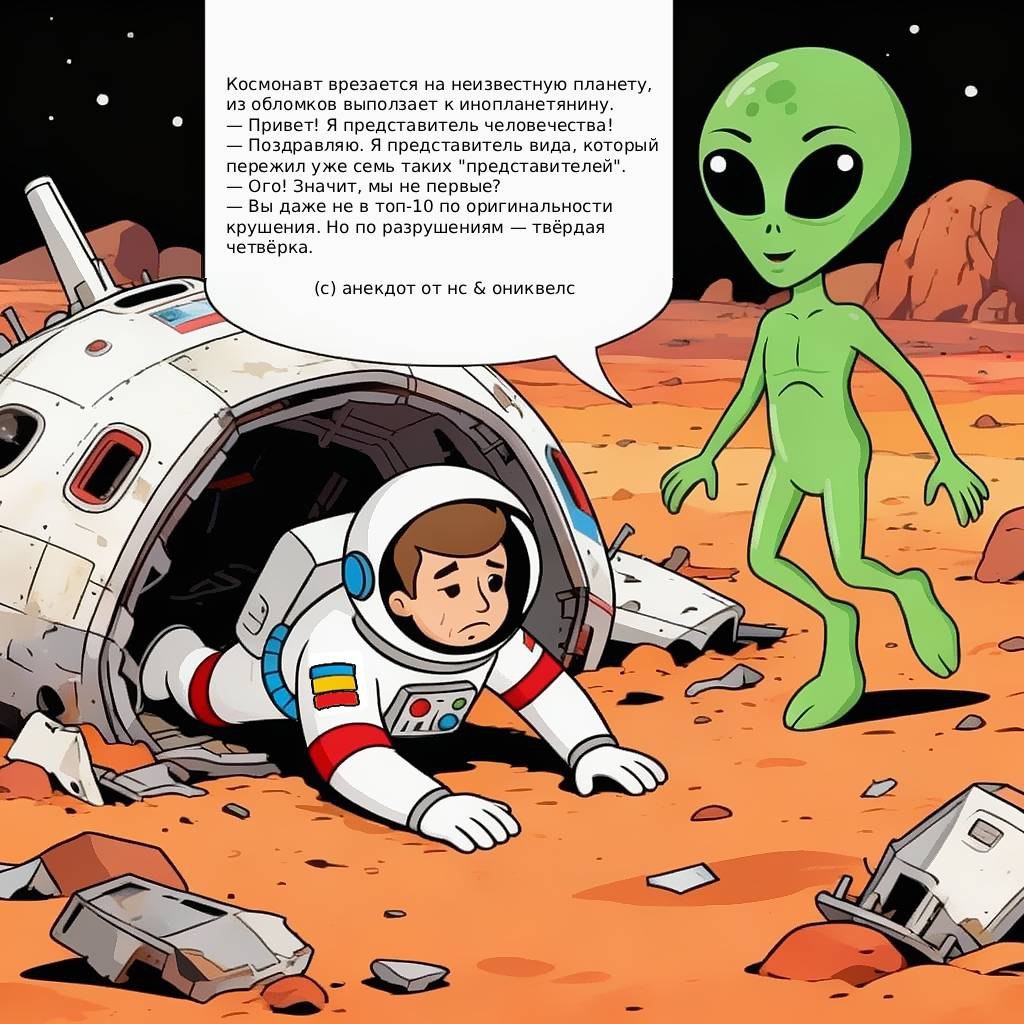 🛰🧑🚀👽🛸 Космонавт врезается на неизвестную планету, из обломков выползает к инопланетянину. — Привет! Я представитель человечества! — Поздравляю. Я представитель вида, который пережил уже семь таких "представителей". — Ого! Значит, мы не первые? — Вы даже не в топ-10 по оригинальности крушения. Но по разрушениям — твёрдая четвёрка. (с) анекдот от нс & ониквелс