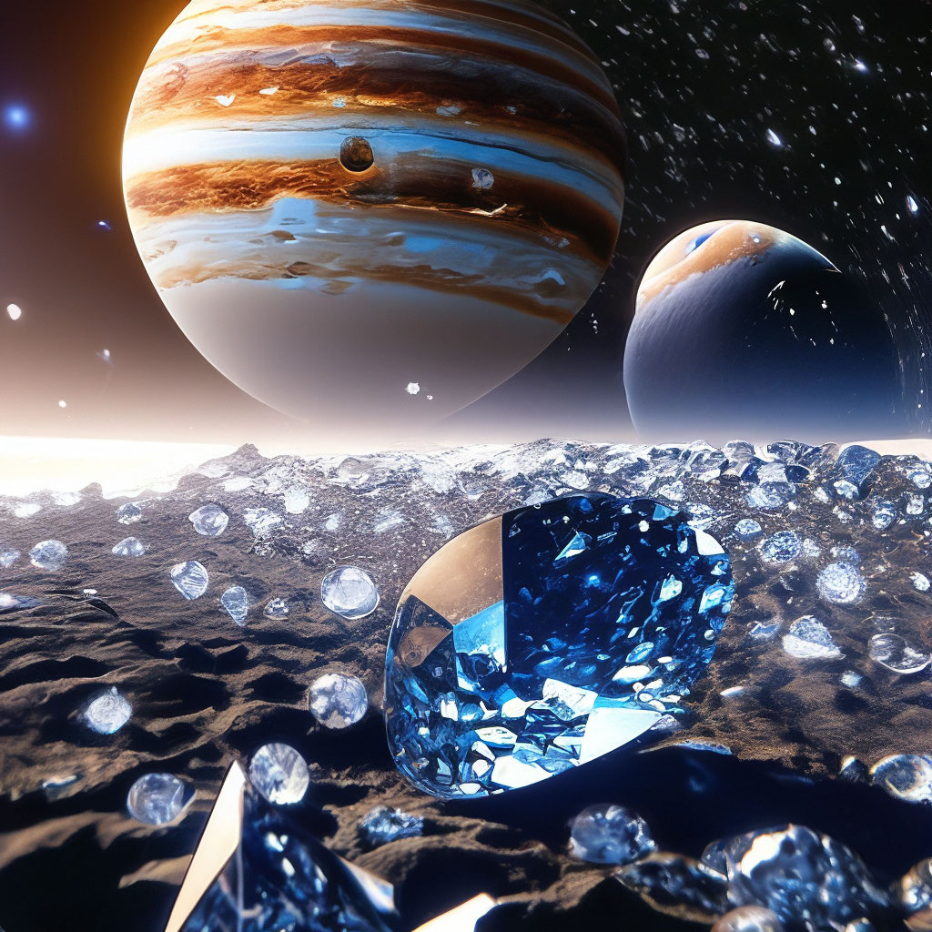 Представьте себе дождь. Но вместо обычных капель воды с неба падают... алмазы! Звучит как научная фантастика, но для газовых гигантов, таких как Юпитер и Сатурн, это вполне может быть реальностью. Условия внутри этих планет совершенно невероятны и не похожи ни на что на Земле. Начало: Углеродный "снег" Атмосфера Юпитера и Сатурна в основном состоит из водорода и гелия, но также содержит метан. Молнии (а на Юпитере они намного мощнее земных!) или солнечная радиация разрывают молекулы метана, высвобождая атомы углерода. Эти атомы углерода, как сажа или графит, начинают падать сквозь атмосферу. Путешествие в ад: Давление и температура По мере падения вниз давление и температура в атмосфере планет-гигантов стремительно растут. На глубине примерно 1600 километров эти невероятные условия (давление в сотни тысяч раз больше, чем на Земле!) буквально "сжимают" углеродный материал, превращая его в куски чистого графита. Сверкающий финал: Рождение алмазов Графит продолжает падать еще глубже.