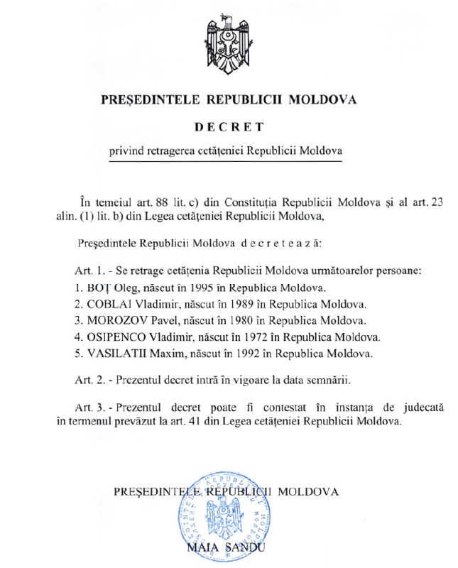 Майя Санду подписала указ о лишении молдавского гражданства пяти человек из приднестровского региона, зачисленных в российские войска. Пятеро мужчин остались без гражданства РМ после того, как поступили на службу в оперативную группу российских войск (ОГРВ), размещённую на левом берегу Днестра. Указ был опубликован на официальном сайте президентуры. https://t.me/Kalinin_PRM