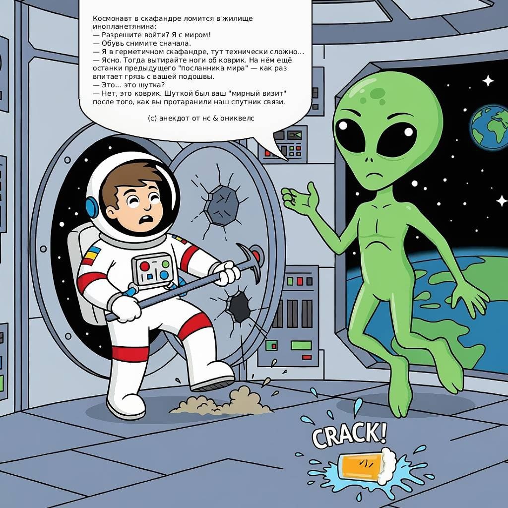 🛰🧑🚀👽🛸 Космонавт в скафандре ломится в жилище инопланетянина: — Разрешите войти? Я с миром! — Обувь снимите сначала. — Я в герметичном скафандре, тут технически сложно... — Ясно. Тогда вытирайте ноги об коврик. На нём ещё останки предыдущего "посланника мира" — как раз впитает грязь с вашей подошвы. — Это... это шутка? — Нет, это коврик. Шуткой был ваш "мирный визит" после того, как вы протаранили наш спутник связи. (с) анекдот от нс & ониквелс