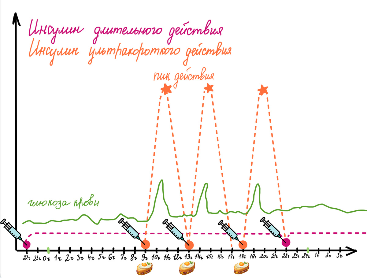 Базис-болюсный режим инсулинотерапии (или режим МЕИ - множественных единичных инъекций) - это режим инсулинотерапии, при котором основная задача - это имитация физиологических фаз секреции инсулина, как у людей без диабета. Разберемся дословно. В норме поджелудочная железа с помощью B-клеток вырабатывает инсулин и имеет 2 вида секреции: 1) Базальная (или фоновая), при котором небольшое количество инсулина секретируется непрерывно в течение суток, независимо от приемов пищи. Ее роль состоит в поддержании нормального уровня глюкозы в крови в периоды между приемами пищи и в ночное время. 2) Постпрандиальная ( «Prandium» от латинского «обед»), при котором инсулин вырабатывается в ответ на повышение глюкозы крови после приема пищи. Она отвечает за усвоение клетками полученной из пищи глюкозы и тем самым возвращает гликемию к нормальным значениям. Базальную секрецию (1) мы имитируем с помощью инсулина длительного или сверхдлительного действия: Гларгин (Лантус, Туджео, Ринглар), Детемир (Ле