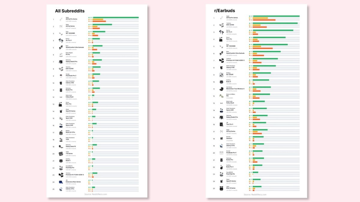 Пользователь Reddit с помощью ИИ проанализировал тысячи обсуждений беспроводных наушников на платформе и собрал таблицу с соотношением отзывов для популярных моделей. За последний год на Reddit чаще всего обсуждали линейку AirPods Pro, она же получила больше всего положительных отзывов. Среди других обсуждаемых моделей — Sony WF-1000XM5, Anker Soundcore, Nothing Ear, OnePlus Buds 4 и другие vc.ru/social/2623153