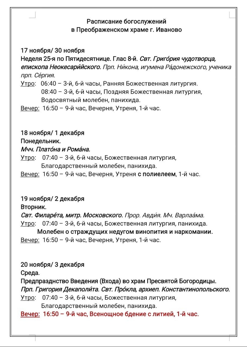 30.11-06.12. Расписание богослужений в Преображенском храме г. Иваново