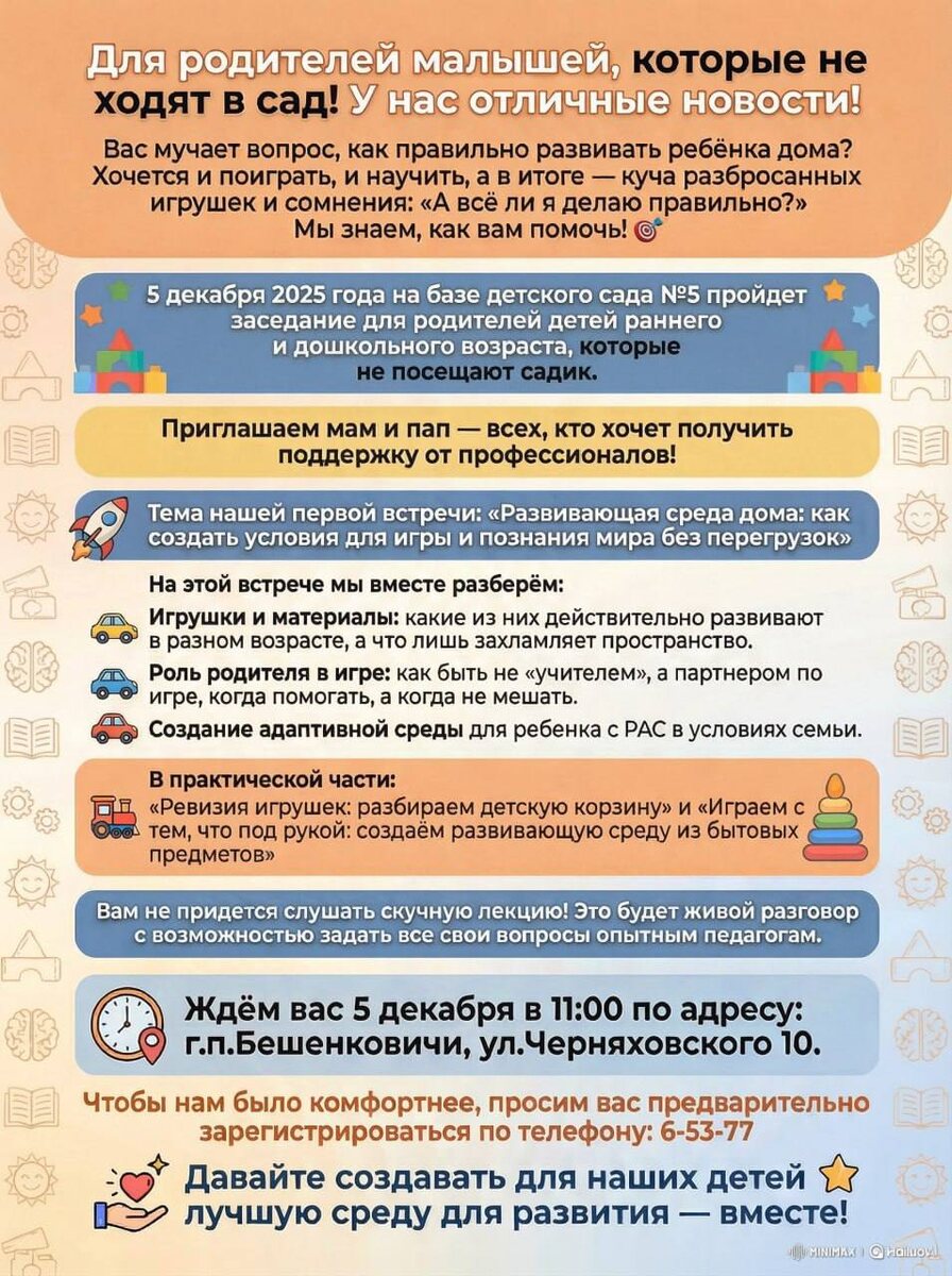 👨👩👧👨👩👧👨👩👧👨👩👧👨👩👧👨👩👧👨👩👧 Важная информация для родителей детей, которые не посещают детский сад! 📍5 декабря на базе детского сада №5 пройдет заседание для мам и пап, которые хотят правильно развивать ребенка дома и нуждаются в помощи профессионалов. ⬆️Подробности в инфографике⤴️