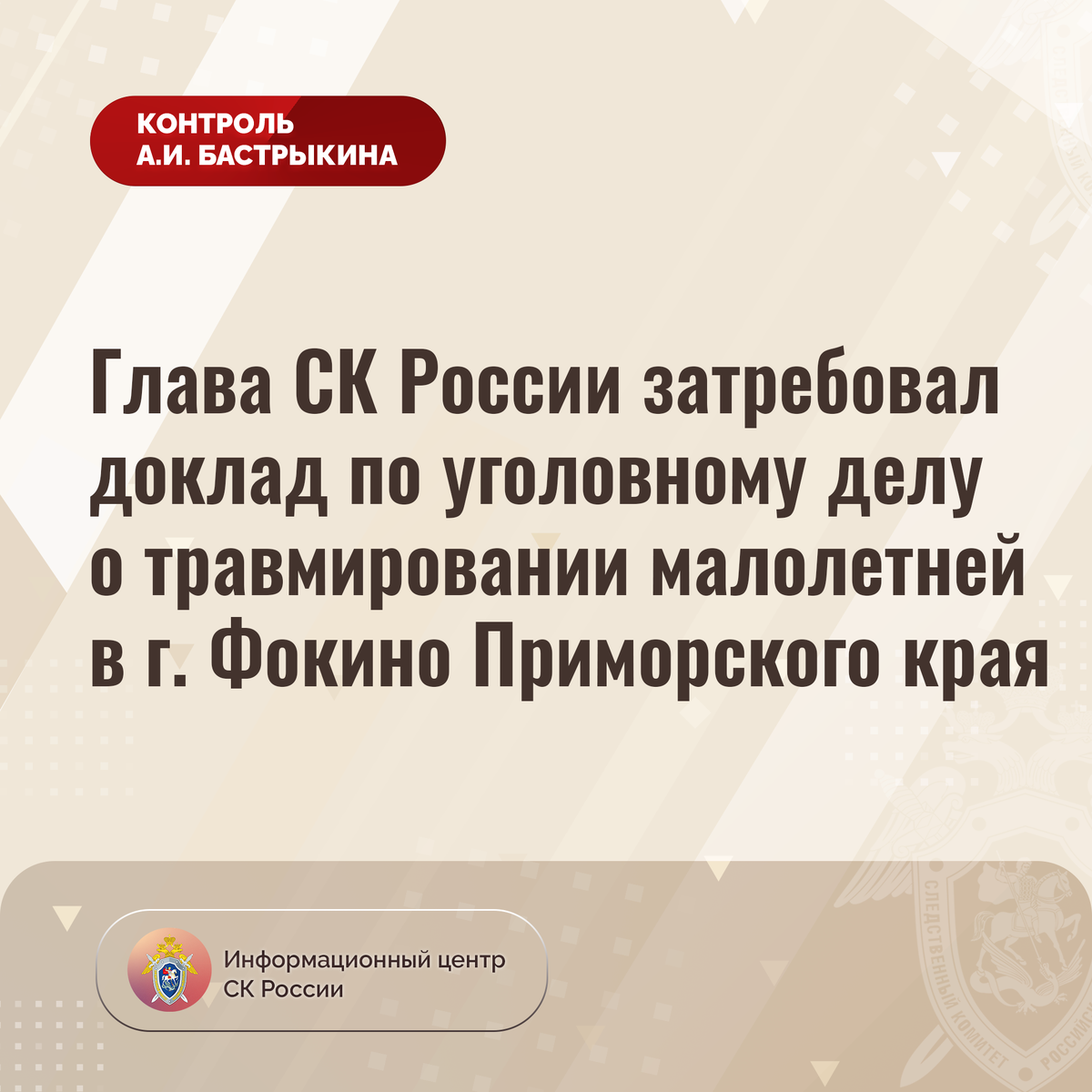 Глава СК России затребовал доклад по уголовному делу о травмировании малолетней в г. Фокино Приморского края
