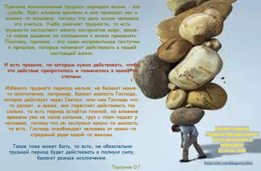 ПРИЧИНА ВОЗНИКНОВЕНИЯ ТРУДНЫХ ПЕРИОДОВ ЖИЗНИ - это судьба. Идет влияние времени и оно приводит нас к какому-то экзамену, потому что цель жизни человека это учиться. Учёба означает трудности, то есть трудности заставляют менять восприятие мира, какие-то новые решения по отношению к жизни применять. Поэтому, причина - это наши неправильные поступки в прошлом, которые начинают действовать в нашей настоящей жизни. И есть ПРАВИЛА, по которым нужно действовать, чтобы это действие прекратилось и поменялось в какой-то степени. Избежать трудного периода нельзя, но бывают какие-то исключения, например, бывает милость Господа, которая действует через Святых, или сам Господь что-то делает, и время, оно перестает действовать так сильно, то есть период остаётся плохой, но влияние времени уже не такое сильное, груз с плеч падает у человека, потому что он заслужил какую-то милость, то есть, Господь освобождает человека от каких-то страданий ради какой-то миссии.