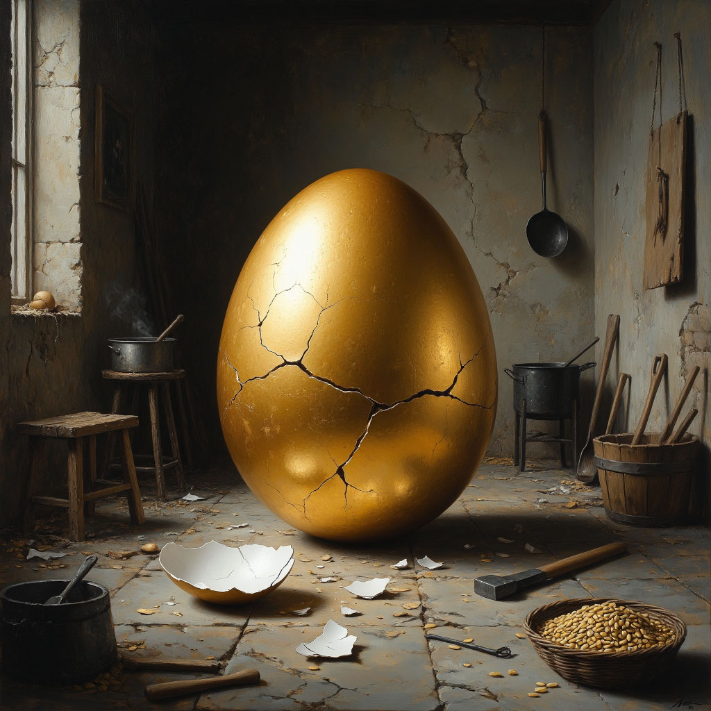 Объясняем на зумерском. Со словарём (в конце). Представляешь, что будет, если тебе с неба свалится настоящий го? Не просто халява, а билет во вселенную беззаботного чилла. Кажется, мечта? А теперь смотри, как обычные дед и баба такой билет просрали... в прямом смысле. История про Курочку Рябу — это не рофл, а жестокий мануал о том, как инфантильность и неспособность проапрувить удачу превращают бумеров в лузеров и главных героев эпик фейла. Готов узнать, как не повторить их ошибку? Тогда листай ниже, ведь эта притча бьет больнее, чем молоток по золотому яйцу. Короче, смотрите, какой кринж разыгрался в одном глухом селе. Жили-были дед и баба. Не то чтобы плохие люди, но вайб от них был так себе — полный экзистенциальный провал. Инфантильность высшей пробы. Осознанности ноль. И была у них, внимание, курочка Ряба. Не абы какая, а чистейший пассивный доход, живой генератор ресурса. Неси яйца — и чилли себе на печи. Но нет, этим бумерам был нужен не стабильный пассив, а сразу весь хайп