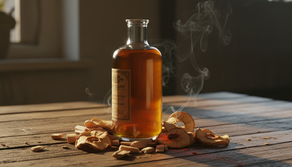 - Бутылка с янтарной настойкой на старом деревенском столе, рядом щепа и карточка с рецептом.