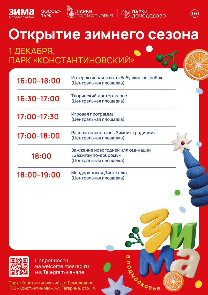 Открытие зимнего сезона в парках Домодедово! ☃️ Совсем скоро парки засияют новогодними огнями, а атмосфера станет по‑настоящему праздничной! Торжественное открытие: в 16:00 – старт праздника в пяти парках одновременно в 18:00 – волшебное зажжение новогодней ёлки! 🎄 💜 Подписывайся на наш канал в MAX