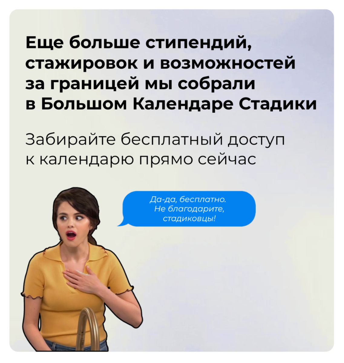 Стадиковцы, держите свежие возможности, на которые ещё открыт приём заявок. Эти программы покрывают обучение полностью и подходят для тех, кто хочет поступить за границу без финансовых барьеров. Доступ к календарю